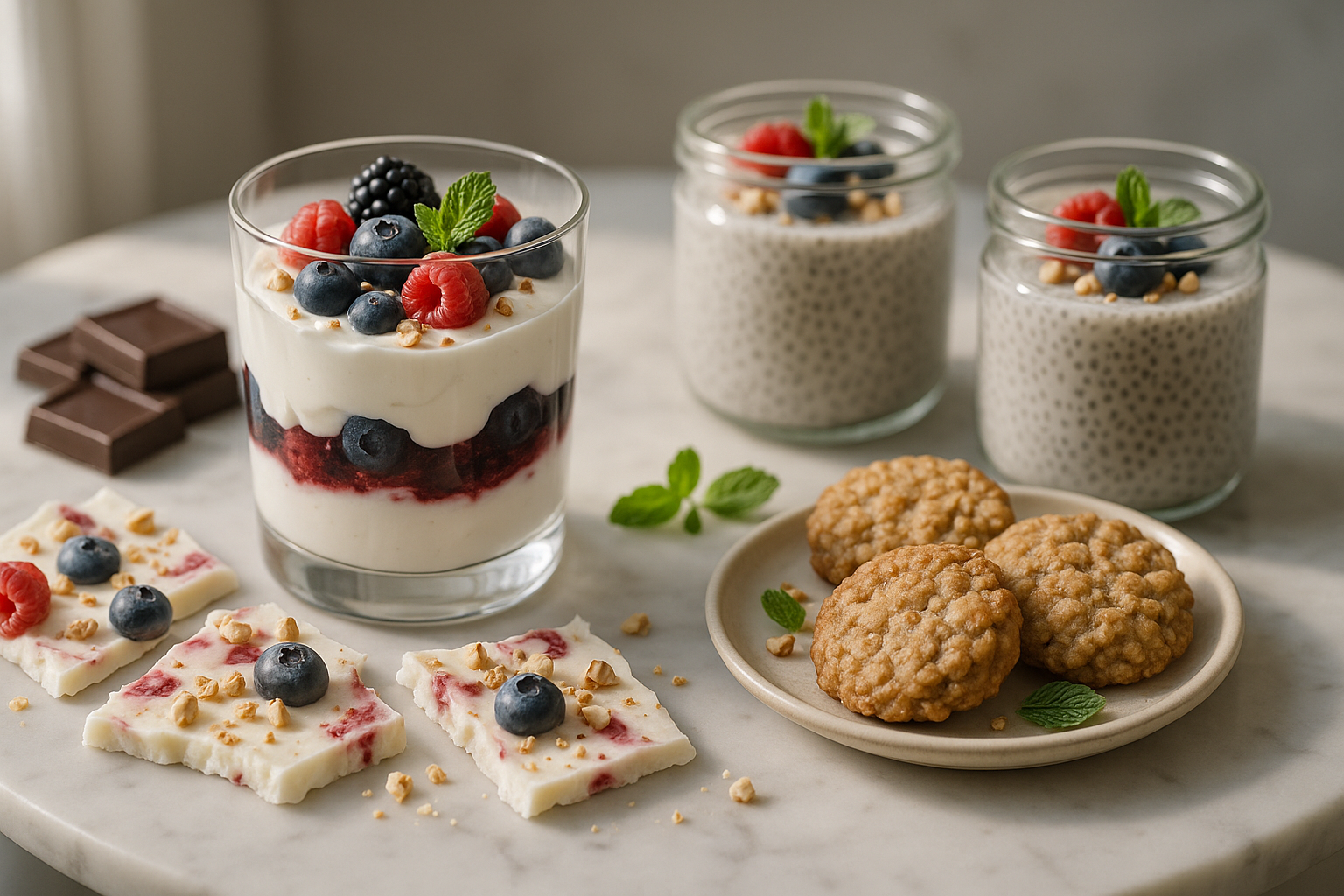 Spread Greek yogurt on parchment paper, top with nuts, berries, freeze, and break into pieces.